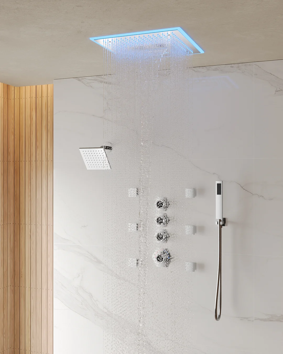 • Innovative Overhead Showerhead: Features a 16-inch stainless steel head with LED lights and Bluetooth music control, offering rainfall, waterfall, and rotating massage water functions for a luxurious shower experience.