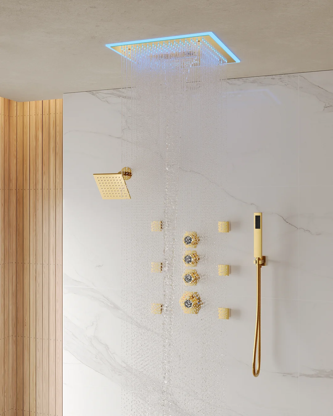 • Innovative Overhead Showerhead: Features a 16-inch stainless steel head with LED lights and Bluetooth music control, offering rainfall, waterfall, and rotating massage water functions for a luxurious shower experience.