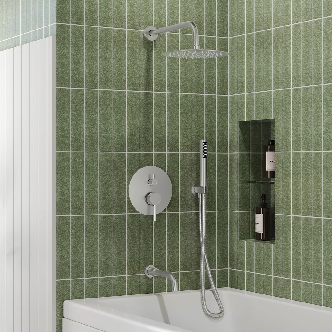 Brushed Nickel shower system includes 10-inch SUS 304 stainless steel and brass joint shower head, handheld shower, and bathtub spout which can perfectly prevent corrosion and leakage. Solid brass shower mixer valve & faucet body made it safe and durable for long time use. Standard wall mounted installation type. Following our installation instructions manual and video, it’s easy to finish the installation with all mounting hardware included.