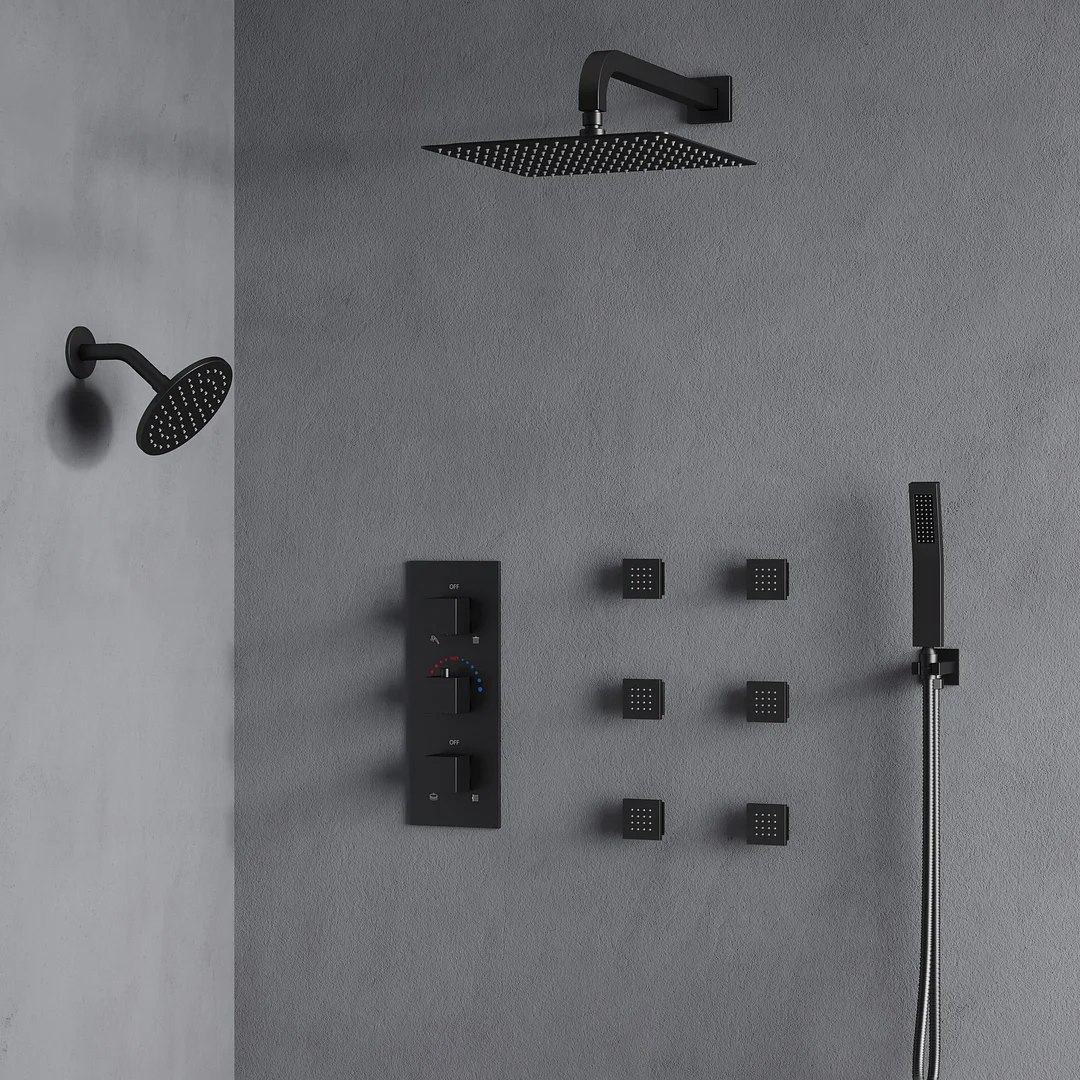 SFS-1017-BK12 Thermostatic Double Shower Head with Hand Shower & 6 Body Jets, Matte Black