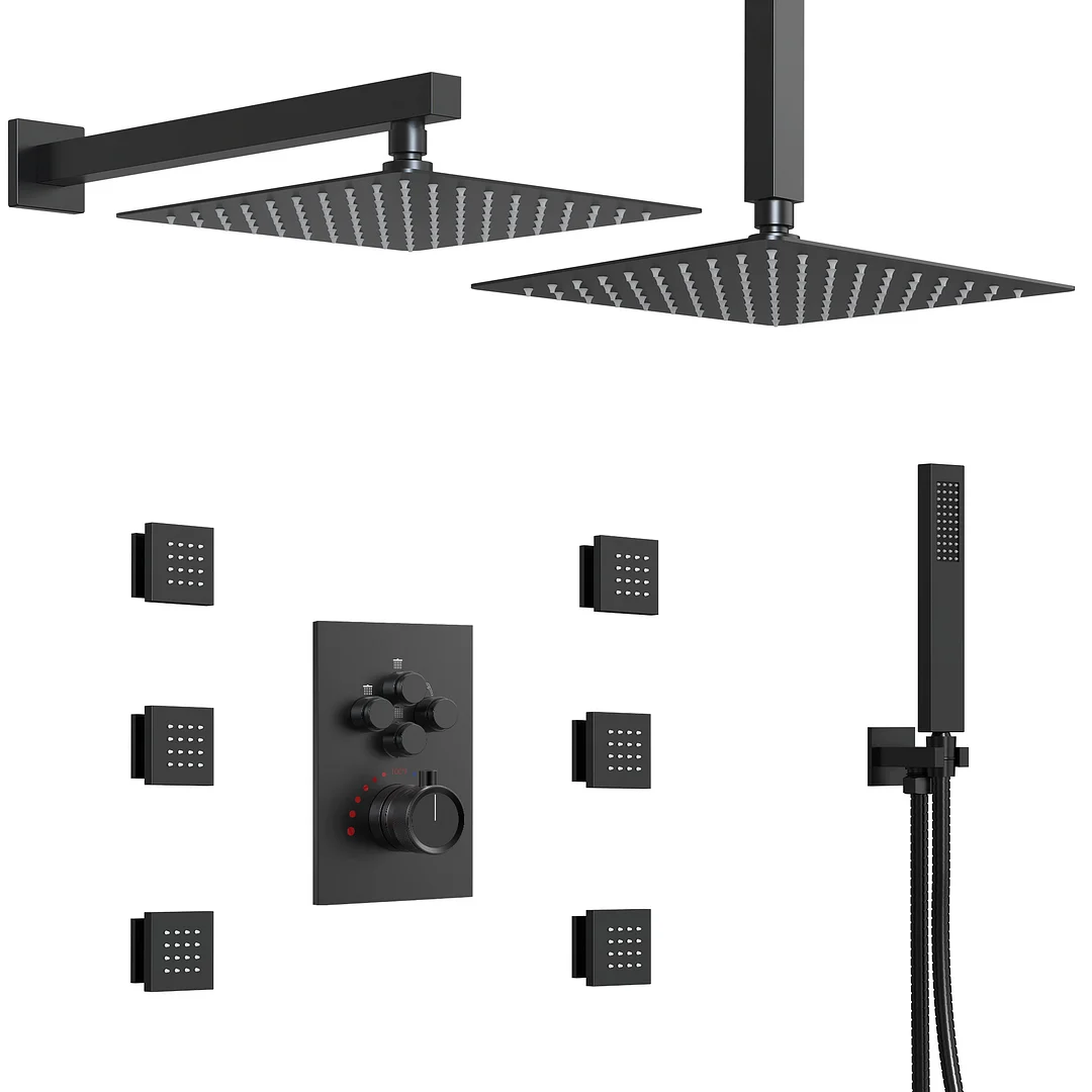 SFS-1032-BK12 12" Ceiling Mount Dual Shower Head and Handheld Shower with 6 Jets in Matte Black(Valve Included)